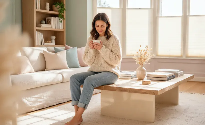 Ein starker Akzent darf nicht fehlen – ein dekorativer Keramikvase in Puderrosa oder Pastellgrün macht den Unterschied. Und unbedingt: ein gemütlicher Kaffeebereich! Ob ein kleiner Beistelltisch mit feinem Porzellan oder die Kaffeemaschine direkt am Fenster – das Licht, der Duft des frischen Kaffees und ein Moment nur für dich schaffen wahre Harmonie.