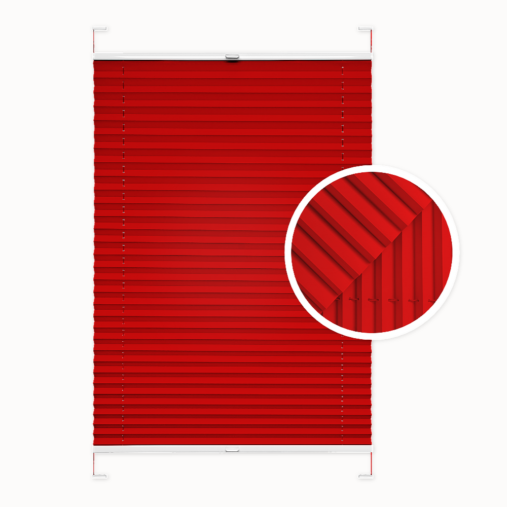 Pleated blind. Color: Red. Installation with or without drilling. Custom-made. Width: 30–140 cm. Height: 40–230 cm. Blackout level: approx. 50%