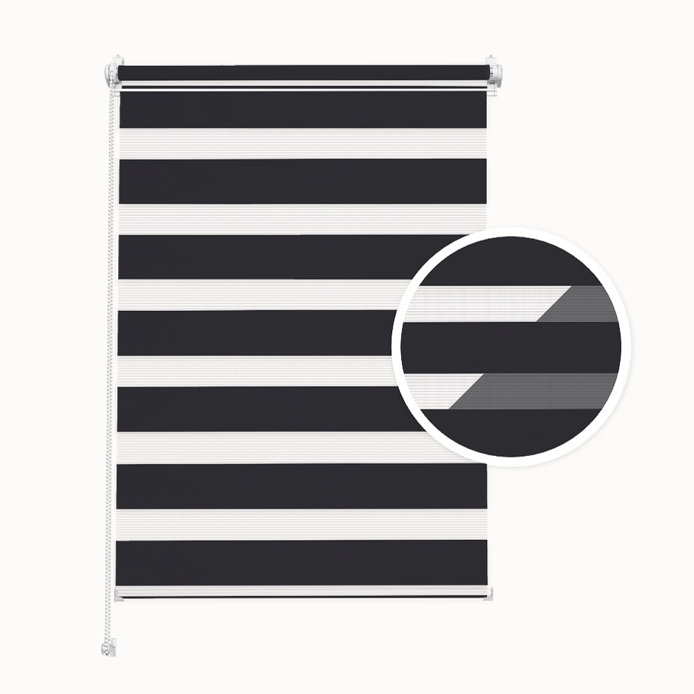 Day and Night Blind. Color: Graphite. No-drill installation. Custom-made. Width: 30–150 cm. Height: 120, 150 or 220 cm. Darkening: approx. 50%.