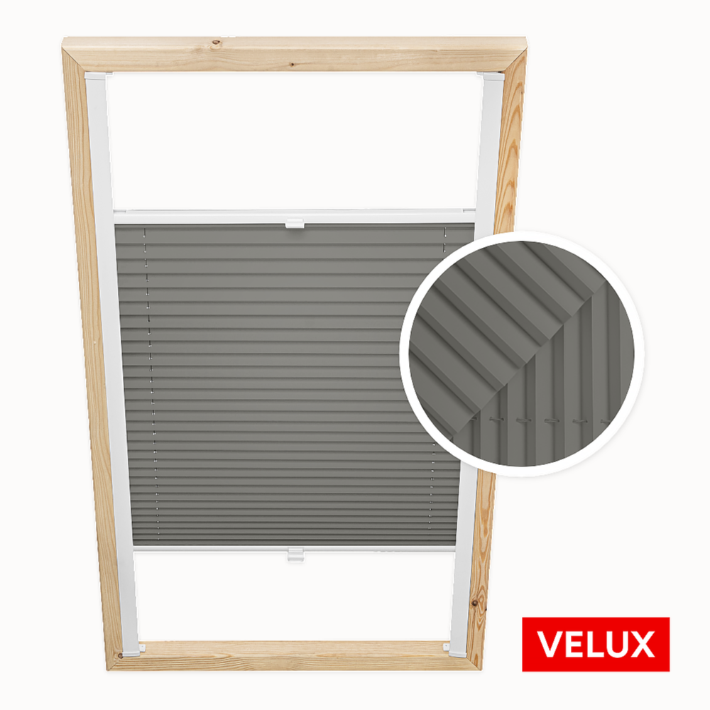 Dachfenster-Plissee für Velux-Fenster. Farbe: Dunkelgrau. Invasive Montage. Verdunkelung: ca. 50%.