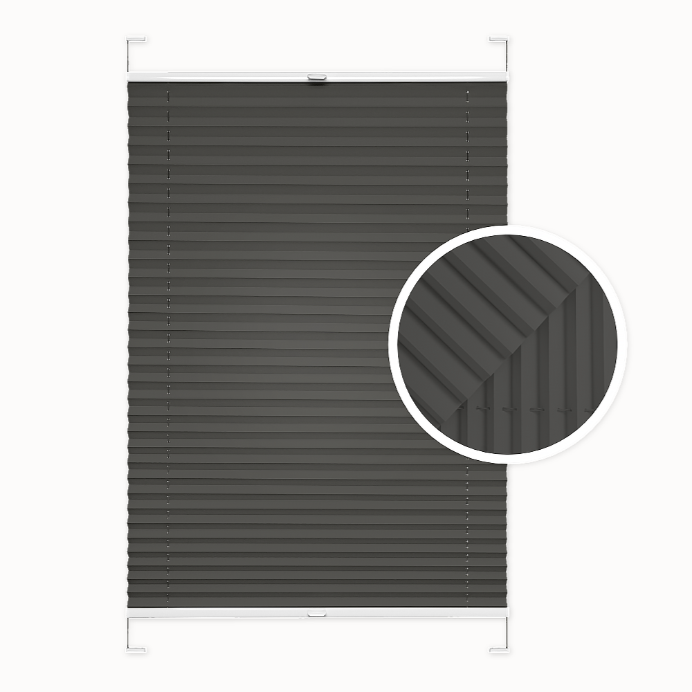 Plissee-Fenster Rollo. Anthrazit Farbe. Invasiver oder nicht-invasiver Einbau. Maßgeschneidert. Breite: 30-140 cm. Höhe: 40-230 cm. Verdunkelung: ca. 50%.