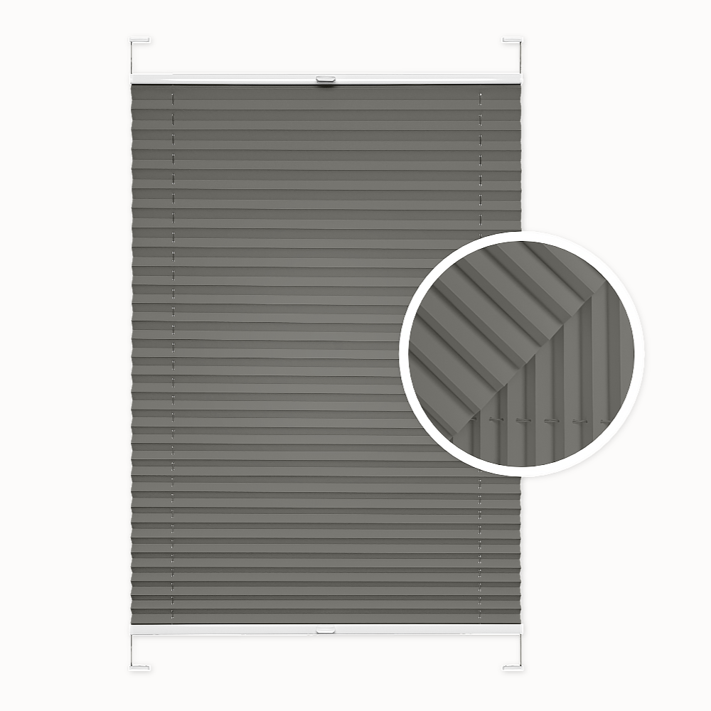 Plissee-Fenster Rollo. Dunkelgrau Farbe. Invasiver oder nicht-invasiver Einbau. Maßgeschneidert. Breite: 30-140 cm. Höhe: 40-230 cm. Verdunkelung: ca. 50%.