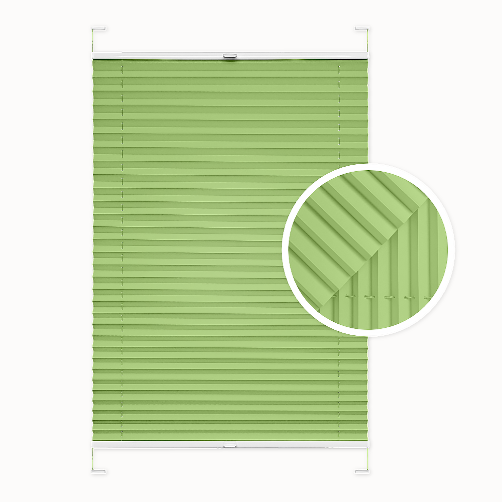Plissee-Rollo für Fenster – Farbe Pistazie. Individuell nach Maß gefertigt. Montage invasiv oder ohne Bohren möglich. Breite: 30–140 cm | Höhe: 40–230 cm. Lichtdurchlässigkeit: ca. 50 %