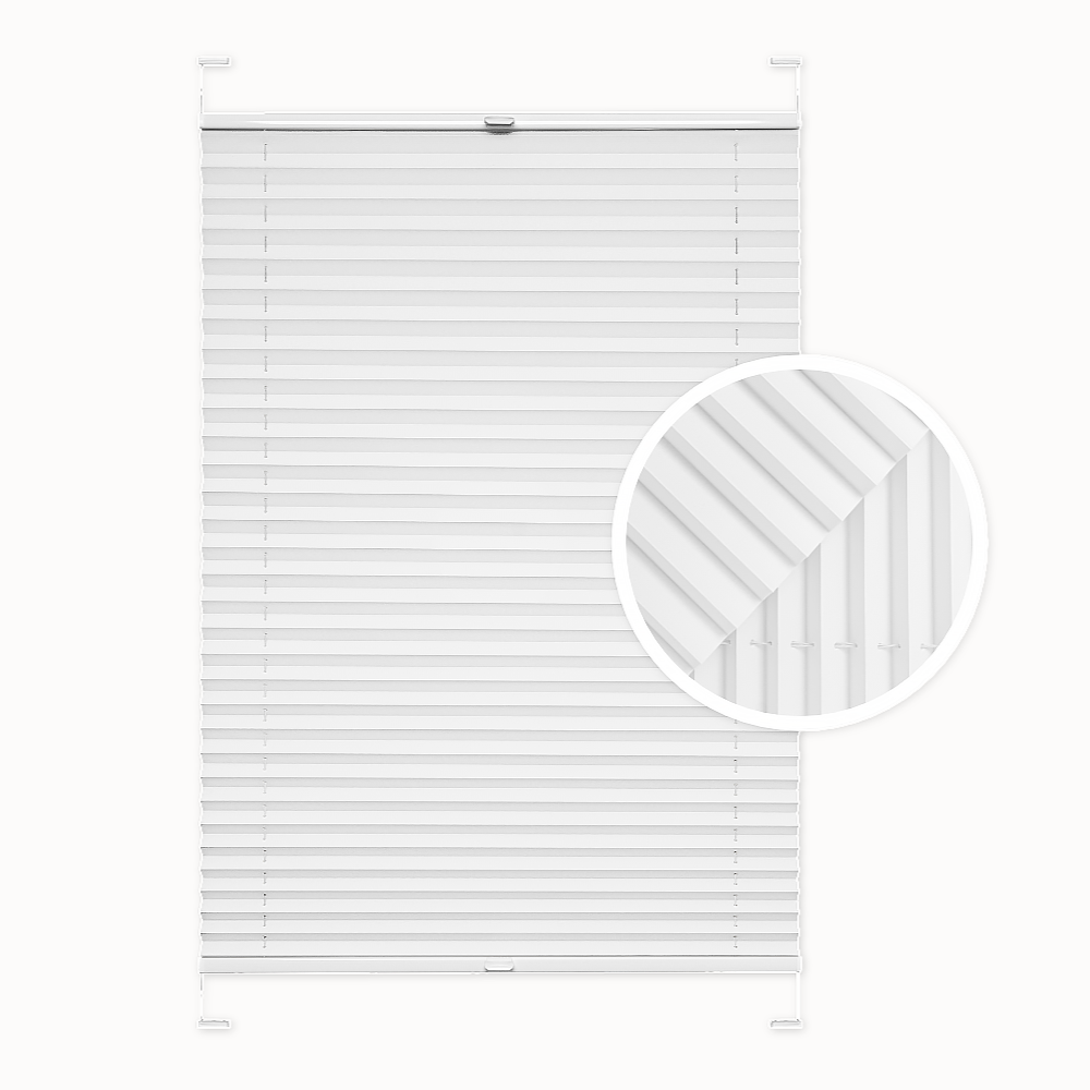 Plissee-Fenster Rollo. Weiße Farbe. Invasiver oder nicht-invasiver Einbau. Maßgeschneidert. Breite: 30-140 cm. Höhe: 40-230 cm. Verdunkelung: ca. 50%.