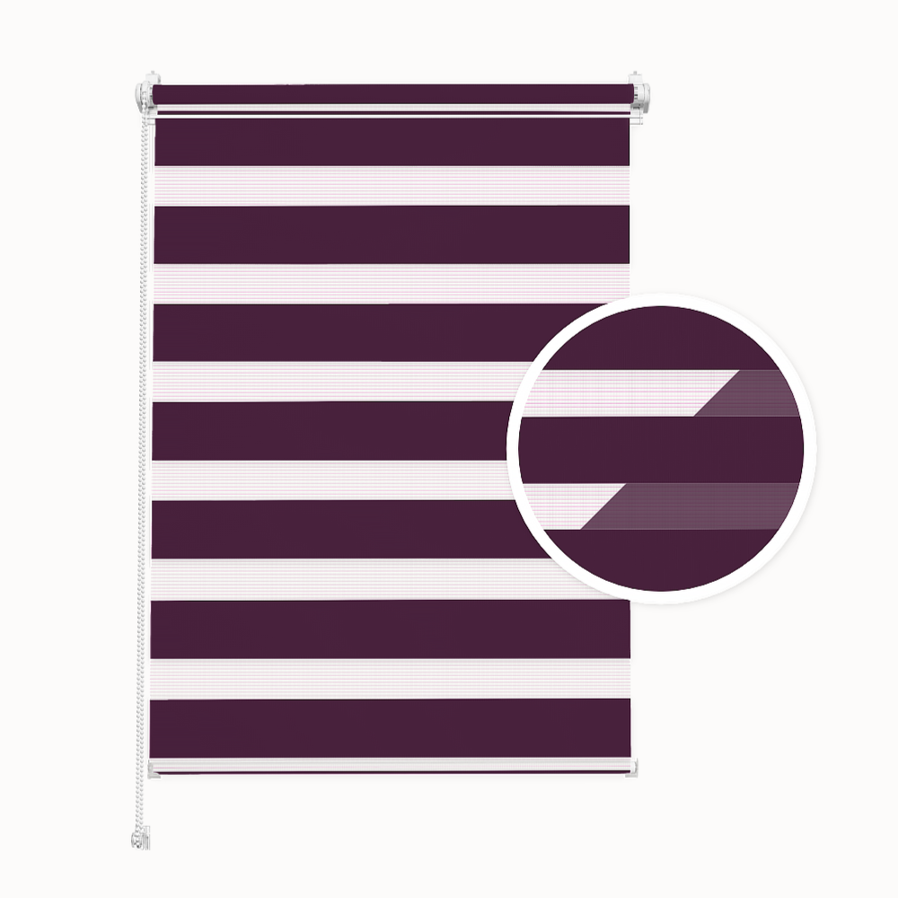 Doppelrollo Tag & Nacht – Farbe: Pflaume. Montage ohne Bohren. Maßanfertigung. Breite: 30–130 cm, Höhe: 40–230 cm. Lichtdurchlässigkeit: ca. 50%.
