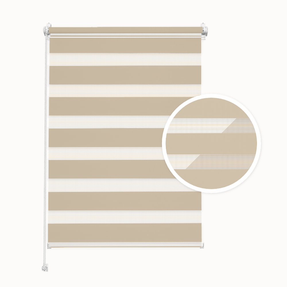 Doppelrollo Tag & Nacht – Farbe: Sandstrand. Montage ohne Bohren. Maßanfertigung. Breite: 30–130 cm, Höhe: 40–230 cm. Lichtdurchlässigkeit: ca. 50%.