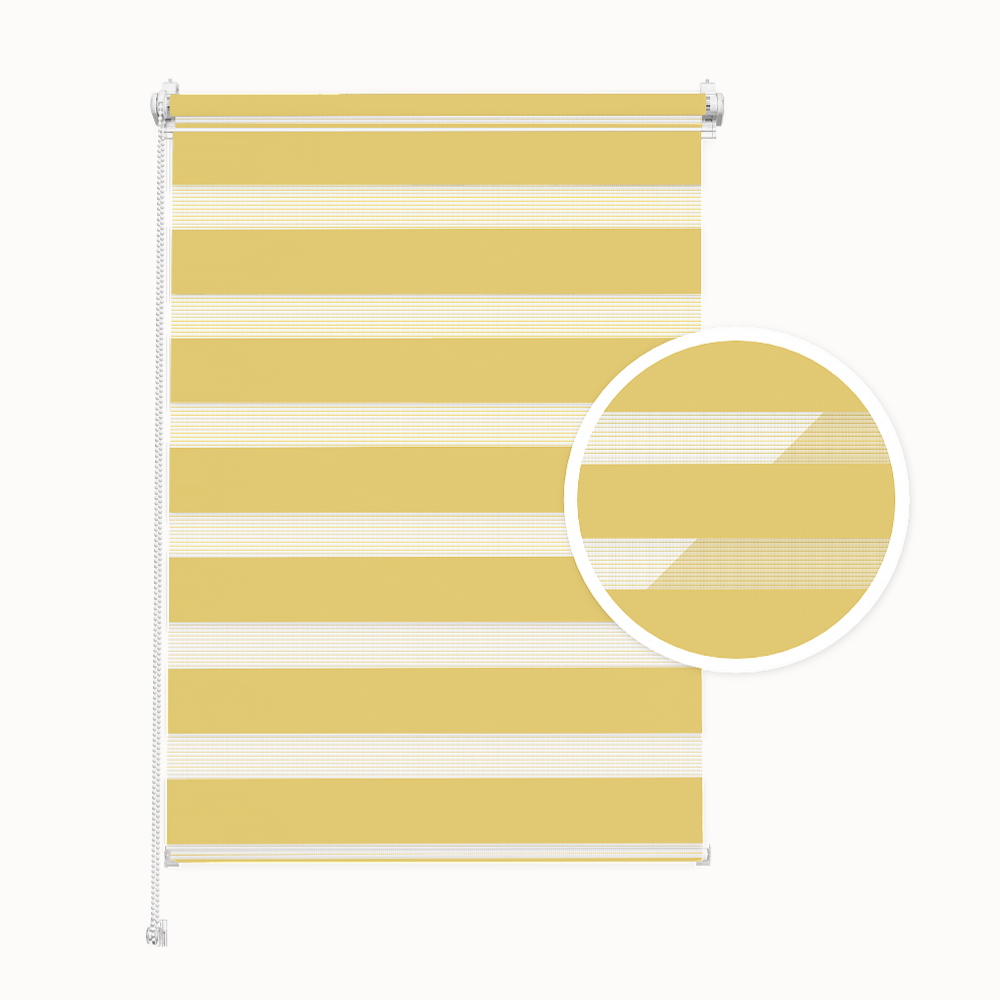 Doppelrollo Tag & Nacht – Farbe: Zitronenlimonade. Montage ohne Bohren. Maßanfertigung. Breite: 30–130 cm, Höhe: 40–230 cm. Lichtdurchlässigkeit: ca. 50%.